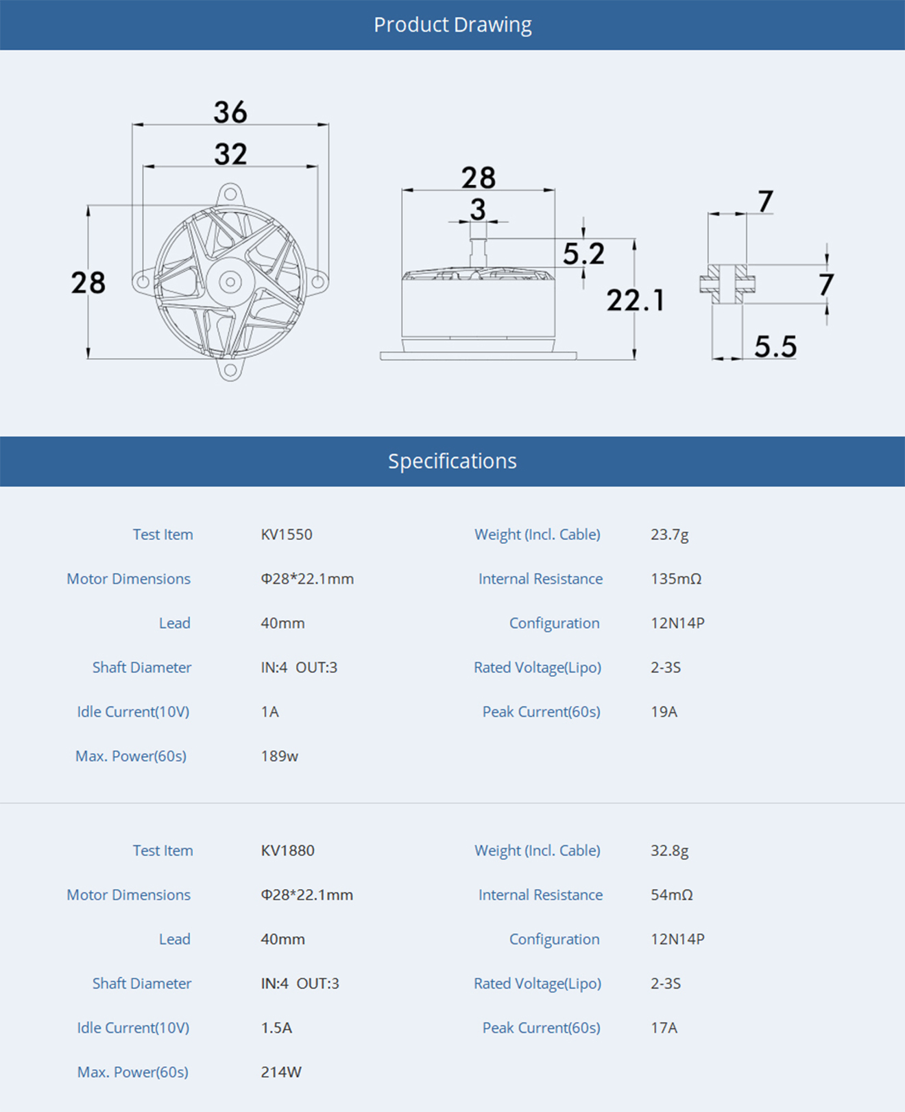 - Weight: 32.2g(KV: 1550KV)32.8g (KV: 1880KV)