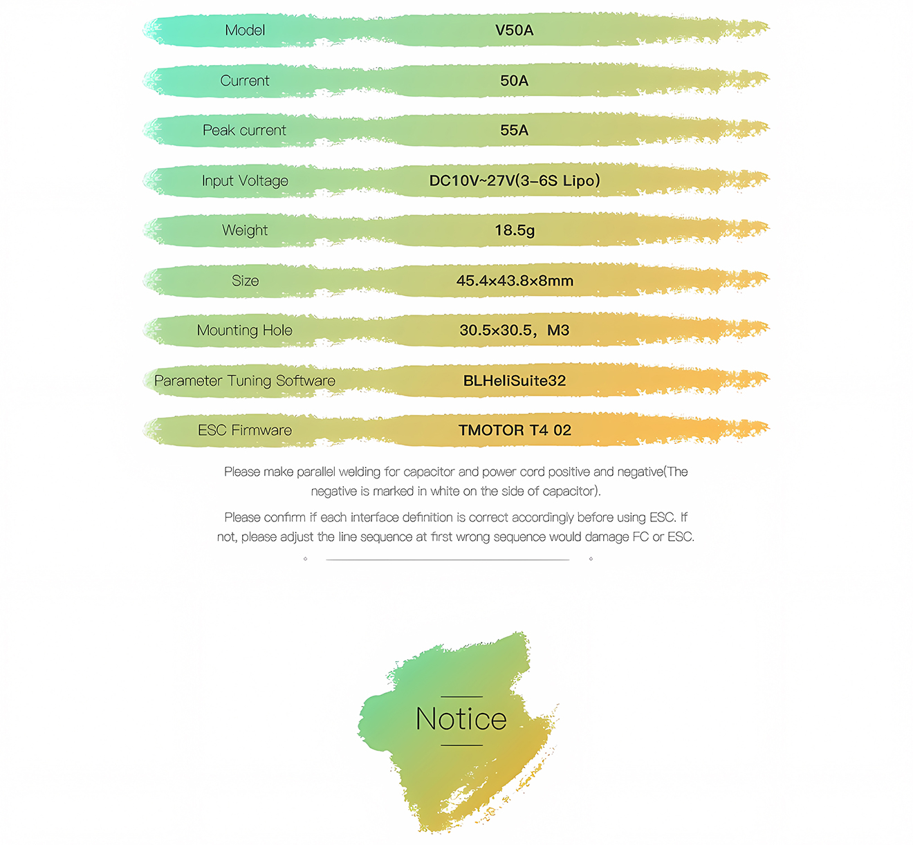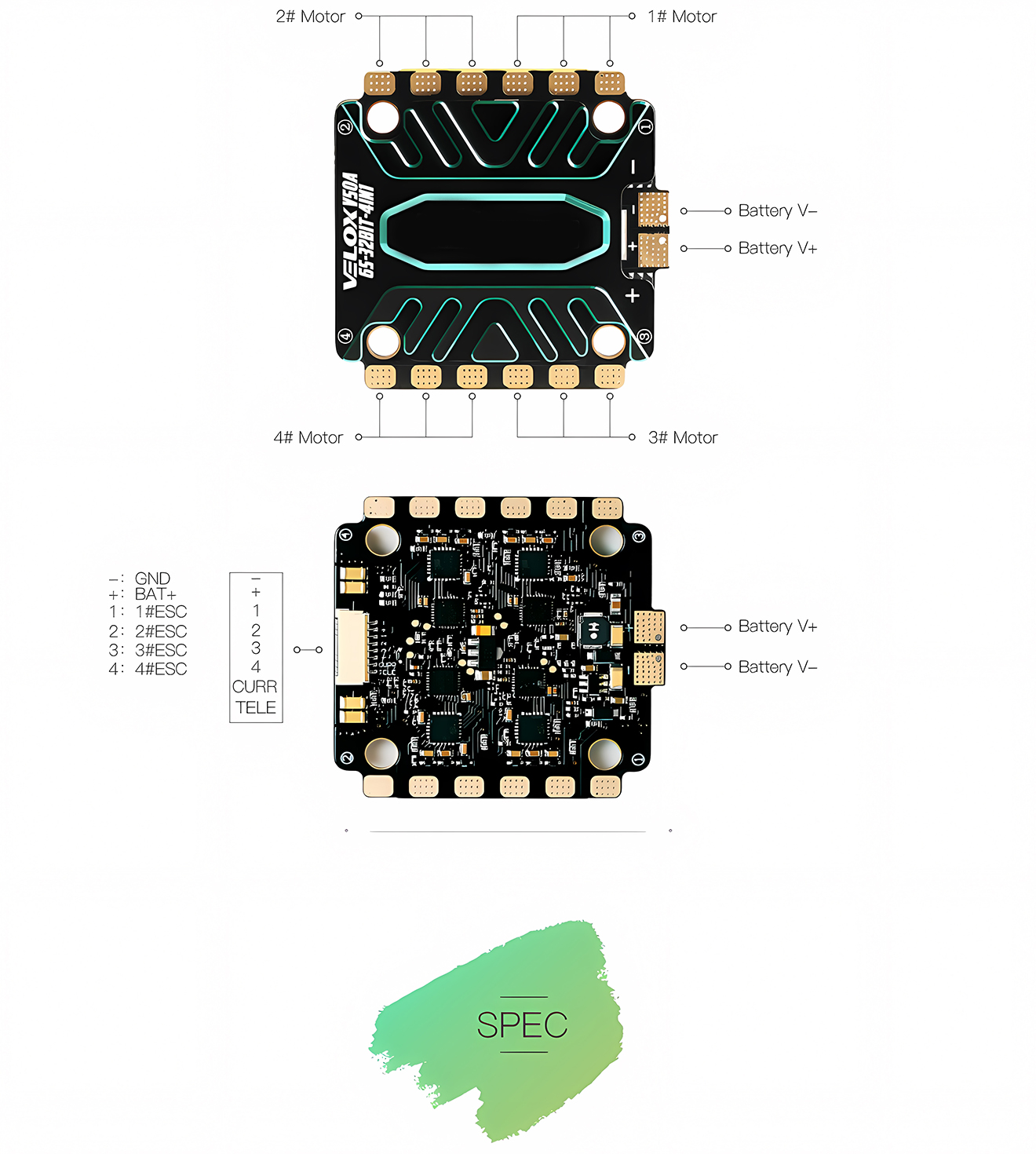 Spacious motor pads make soldering easier.