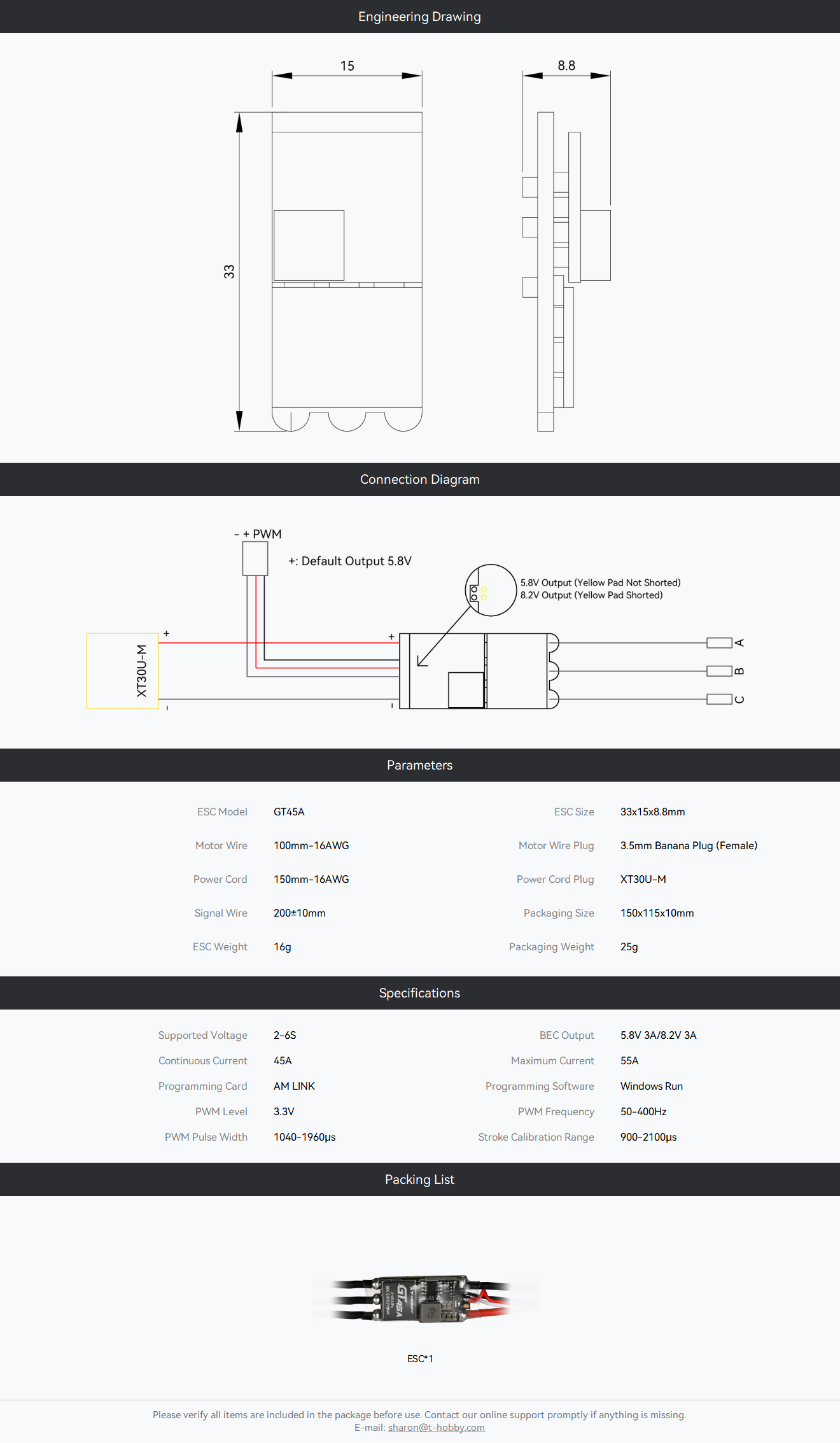 The T-HOBBY GT45A 45A FPV & Fixed-Wing ESC delivers smooth, precise, and efficient power control for FPV drones and racing wings. Designed for F2C, F3E, and F5D aircraft, it features an adjustable BEC and advanced cooling for stable high-speed performance.