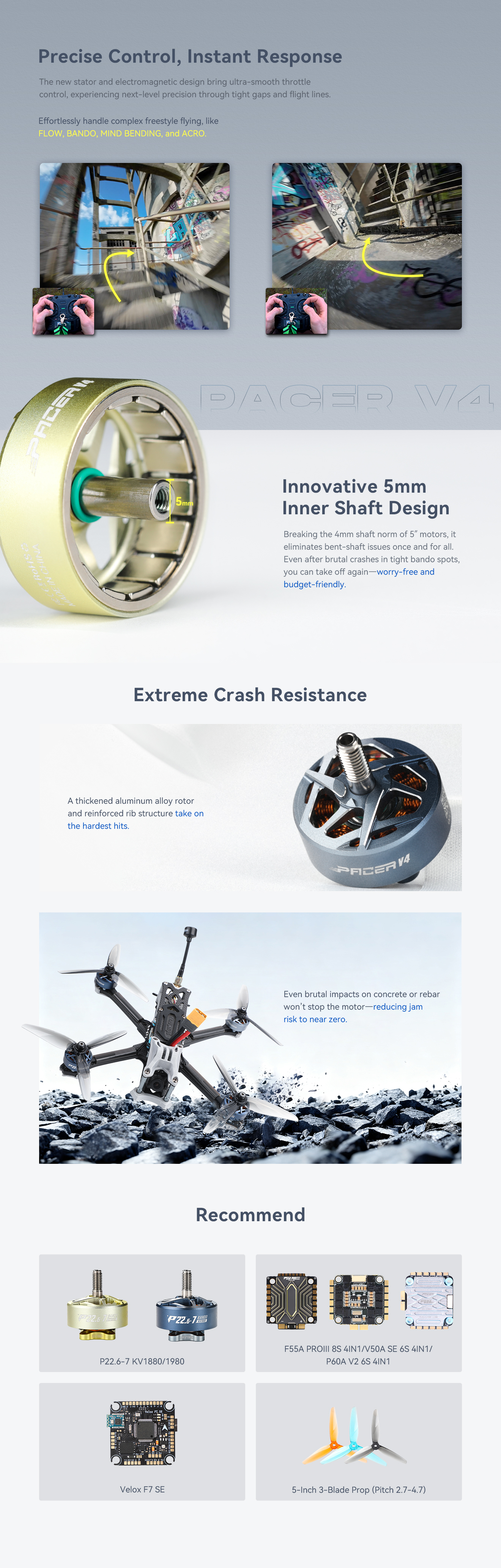 Featuring a reinforced 5mm inner shaft, robust crash-proof structure, and ultra-smooth throttle response, this motor delivers powerful, reliable performance for 5-inch freestyle, bando, acro, and technical gap-flying.
