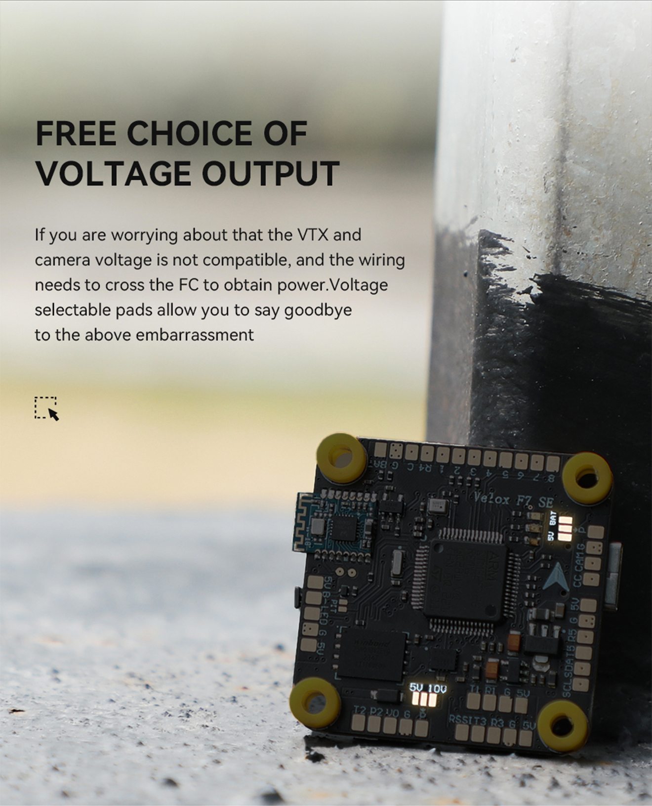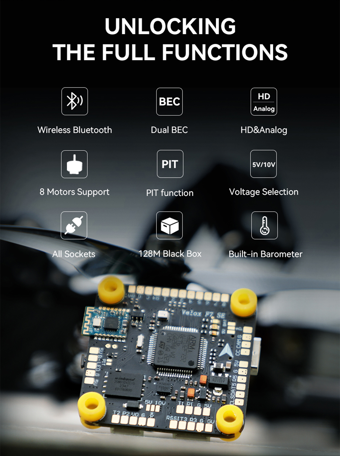 Experience the full functionality of VELOX F7 SE flight controller. Enhanced safety with Betaflight wiring standard. Precise control, seamless compatibility, and wireless parameter adjustment. Enjoy worry-free flying with 128M black box. Upgrade your FPV experience now!