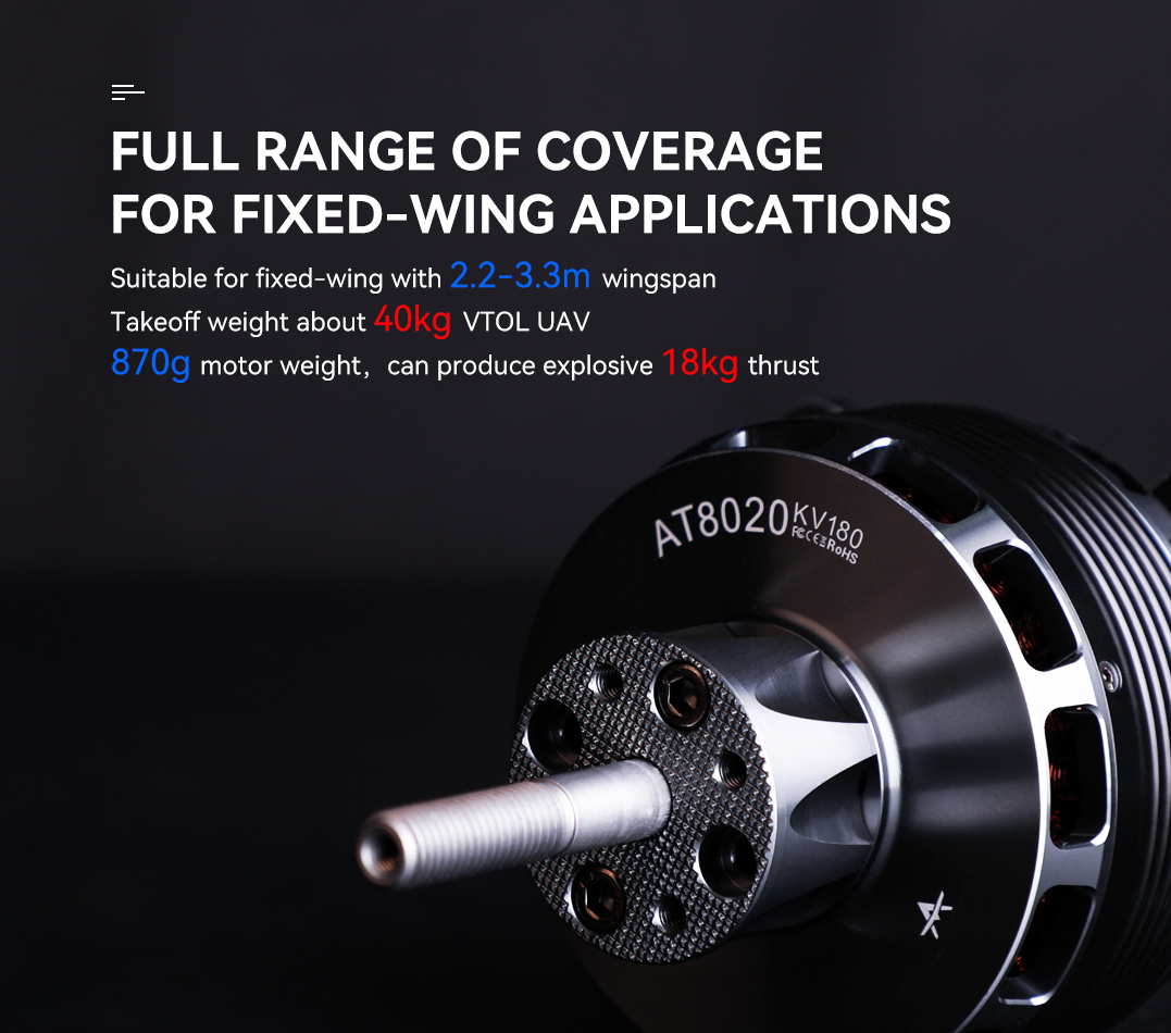 The T-HOBBY AT8020 is a high-performance brushless motor specifically designed for VTOL UAV fixed-wing aircraft with a wingspan of 2.2m to 3.3m and a take-off weight of approximately 40kg. Weighing only 870g, this motor delivers an impressive maximum thrust of 18kg and a peak power output of 5500W, making it an ideal choice for demanding aerial applications. The motor is compatible with 10-12S LiPo batteries and AT195A ESC, ensuring stable and efficient flight performance.