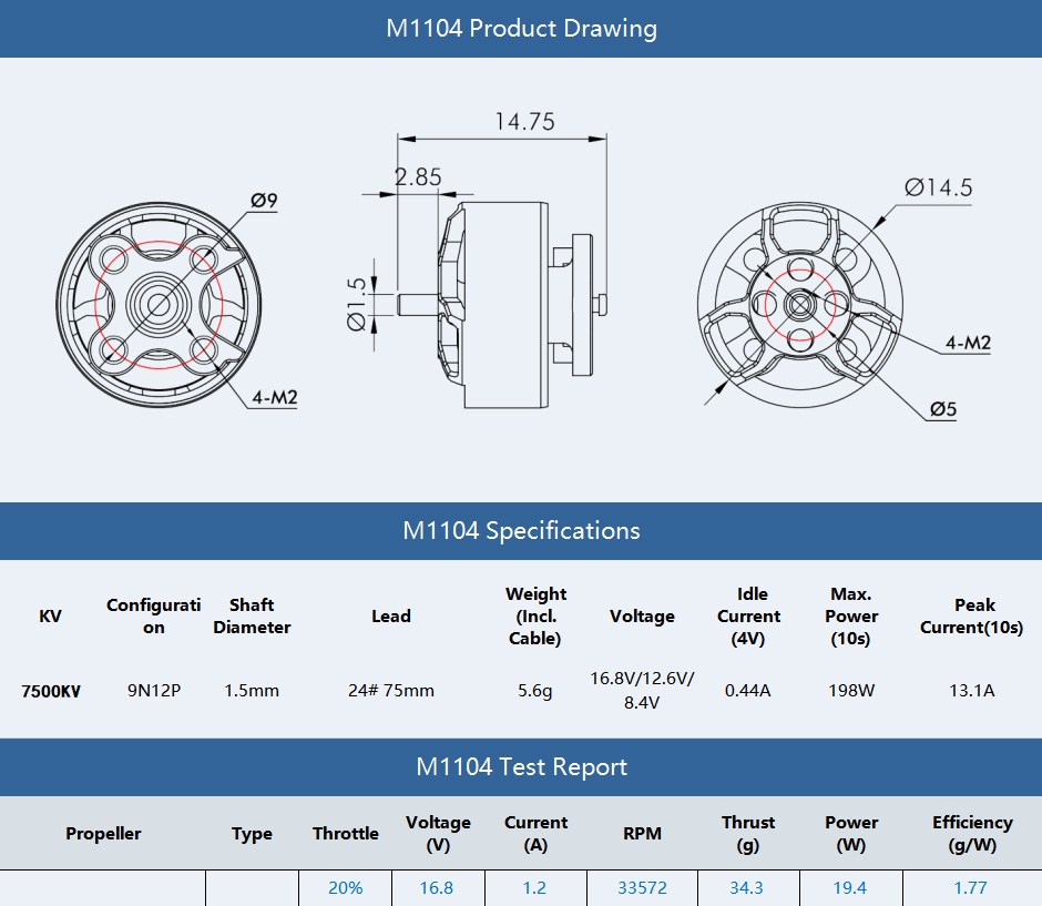 The TMOTOR M1104 is a micro-sized motor that is perfect for your 2-3S toothpick builds! It is much more durable with the unibell design.